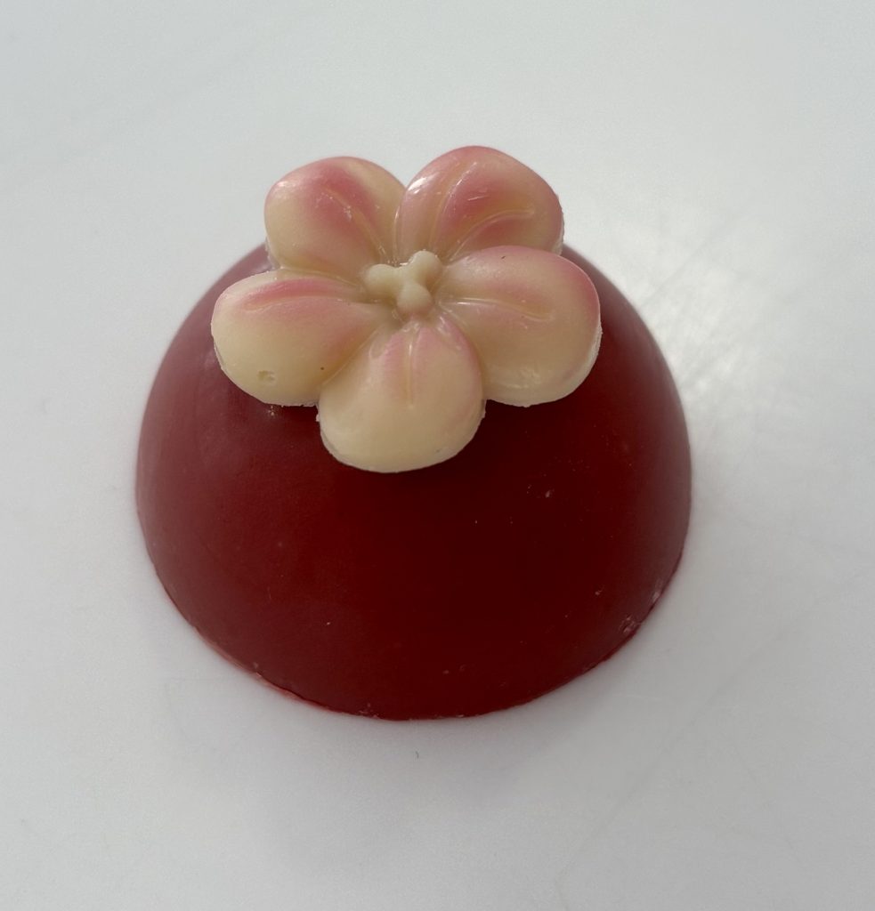 Cherry puree, pistachio ganache in a ruby chocolate shell topped with a white chocolate flower. Allergens; NUTS, MILK, SOYA. May contain traces of GLUTEN, PEANUTS, other NUTS, EGG.