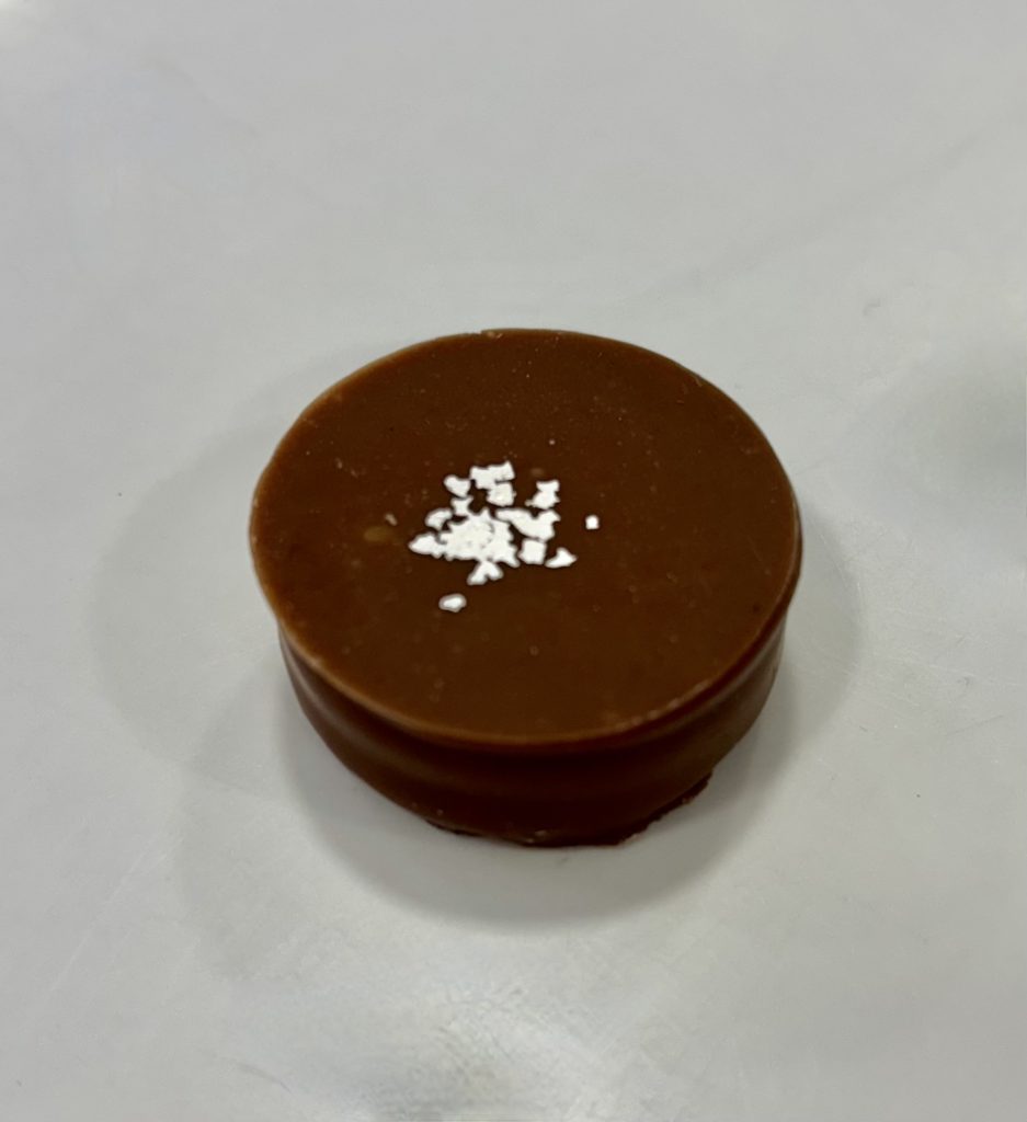 A caramel chocolate shell filled with a rich, smooth salted caramel. Allergens; MILK, SOYA. May contain traces of GLUTEN, WHEAT, NUTS, PEANUTS, EGG, SULPHITES.